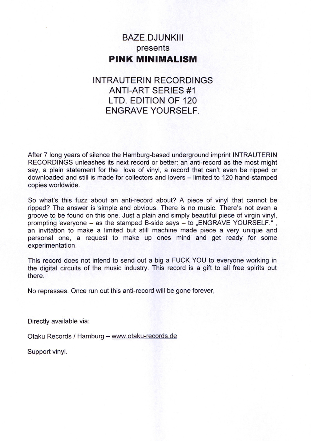 a BAZE.DJUNKIII PRESENTS PINK MINIMALISM b INTRAUTERIN RECORDINGS ANTI-ART SERIES #1 LTD.EDITION OF 120 ENGRAVE YOURSELF. |