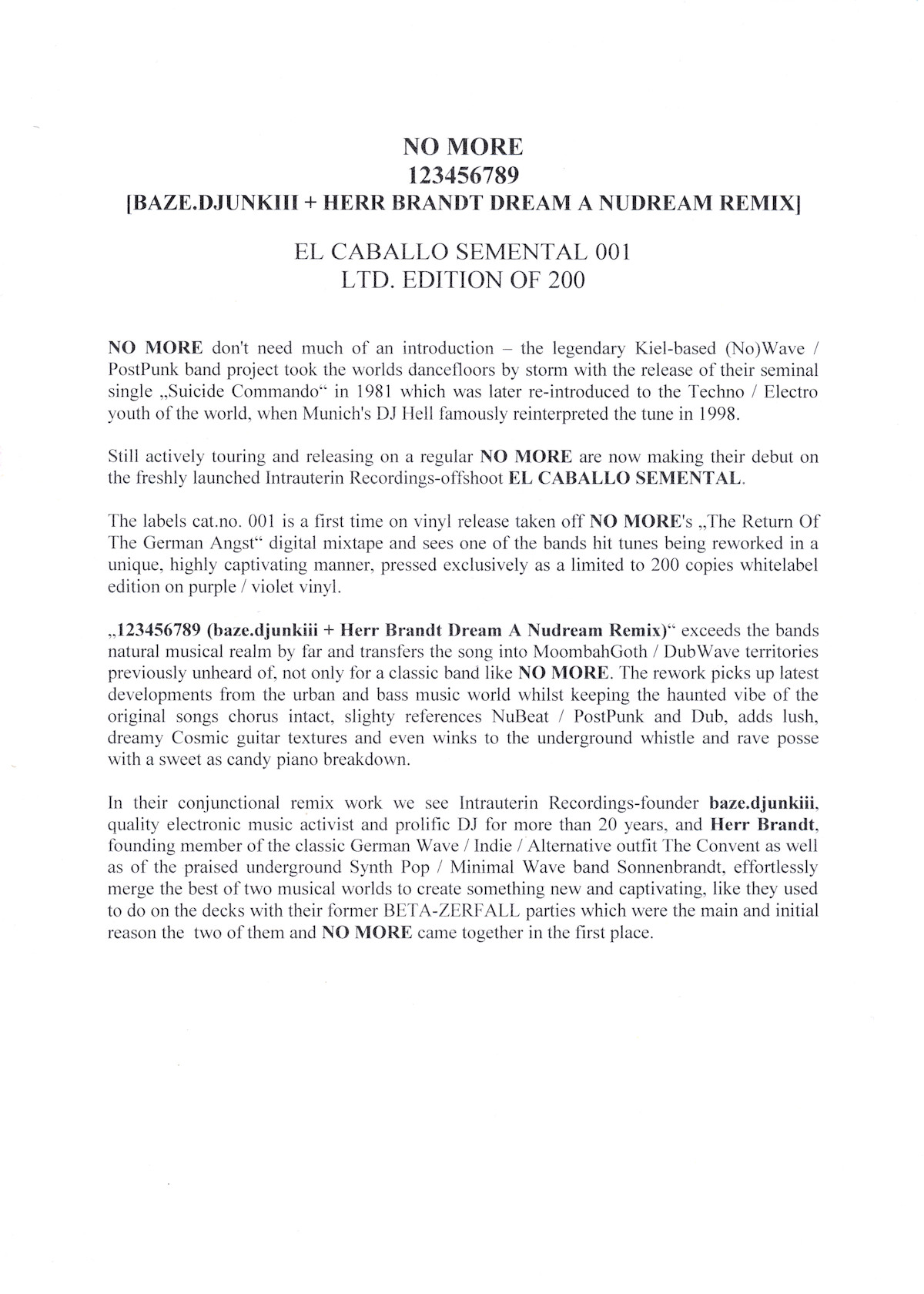 . no more - 123456789 (baze.djunkiii + herr brandt dream a nu dream remix) . (03.2019 el caballo semental 001) one-sided stamped 7" purple vinyl