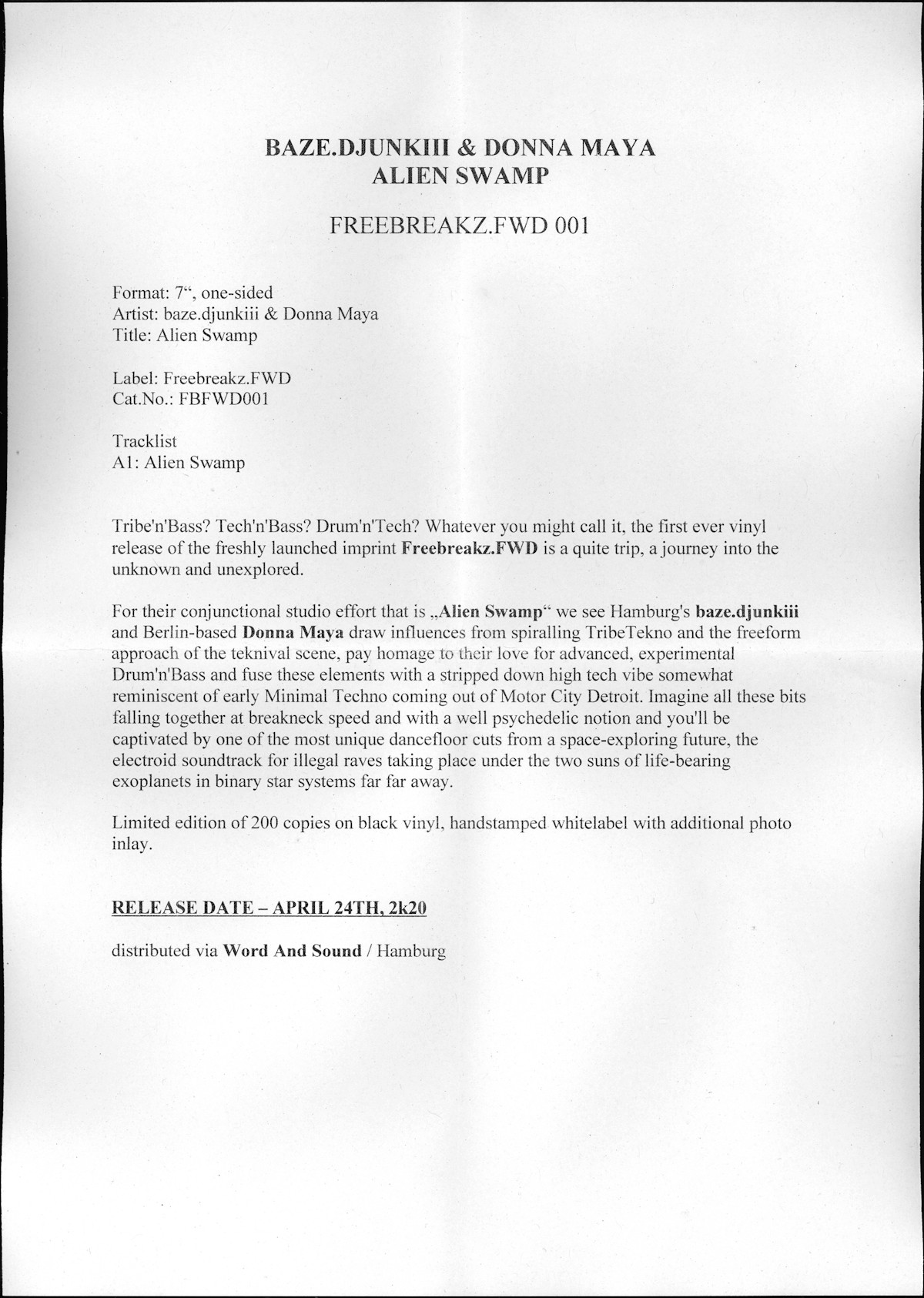 (04.2020 freebreakz.fwd fbfwd001) one-sided stamped 7" whitelabel a1 alien swamp45rpm limited edition of 200 |