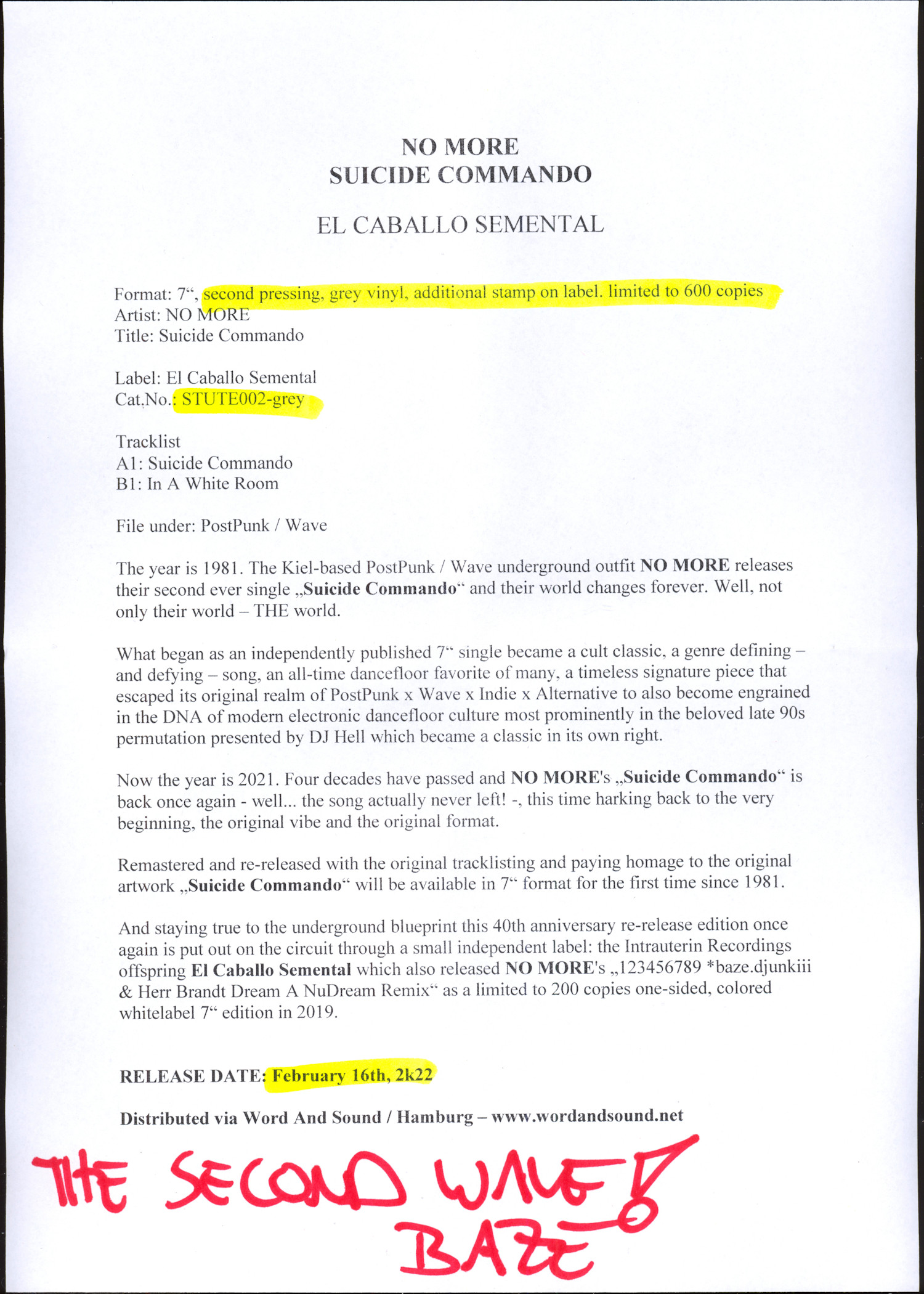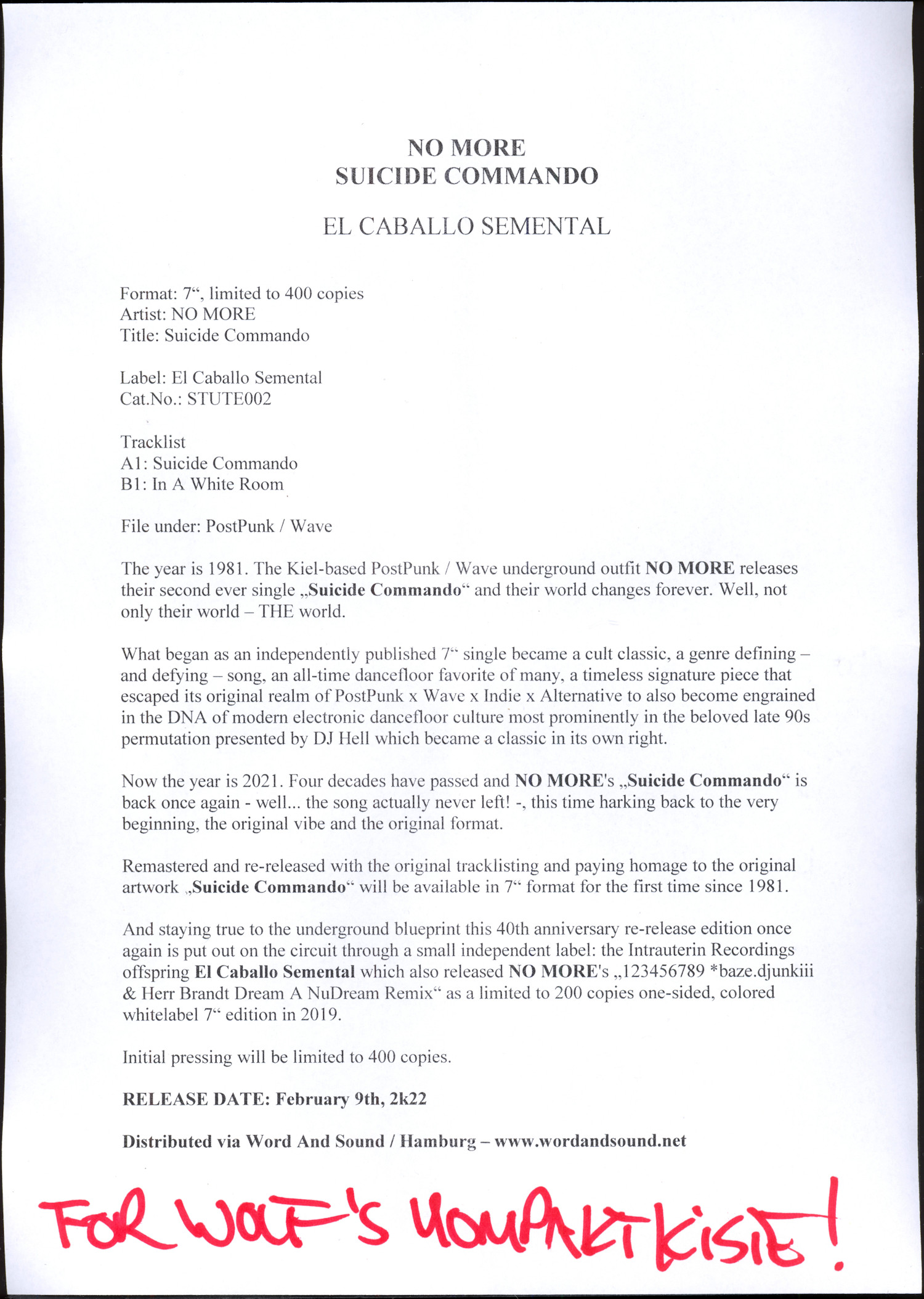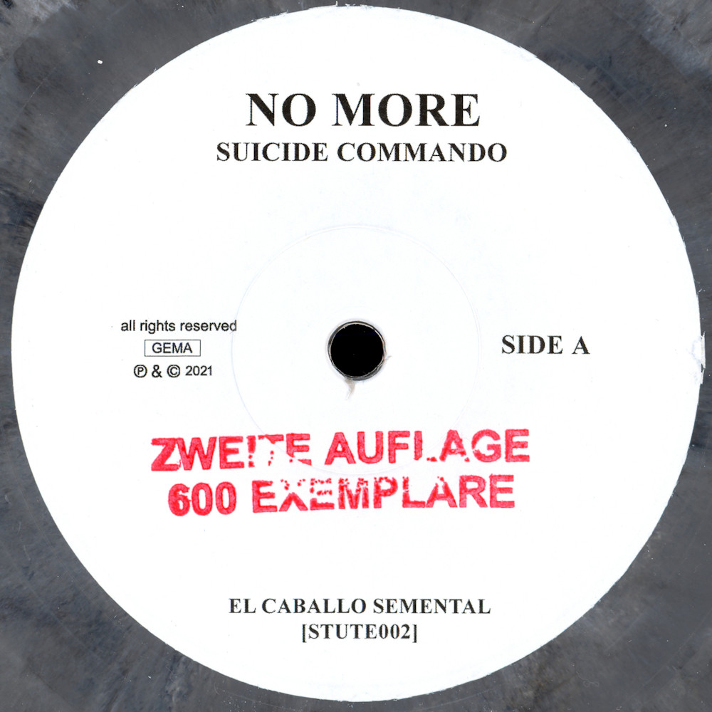 (16.02.2022 el caballo semental stute002) 7" grey marbled vinyl a1 suicide commando b1 in a white roomthis record is a remastered re-release of the original 7" single from 1981. original artwork by no more / s.brose lyrics by a.schwarz, music by a.schwarz / t.sanudakura / c.darc nomoremusic.eu (p) & (c) 2021 format: 7", second pressing, additional stamp on label. limited to 600 copies |