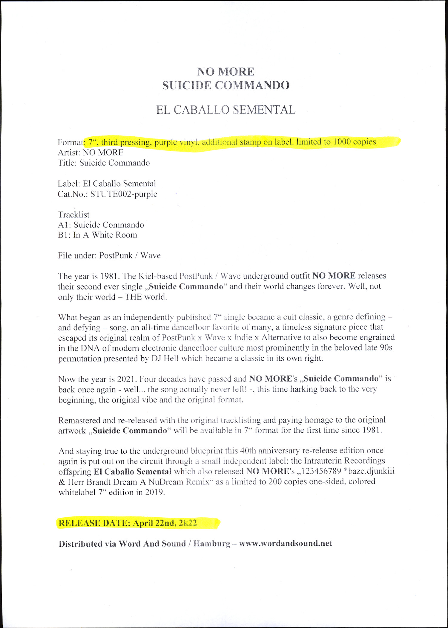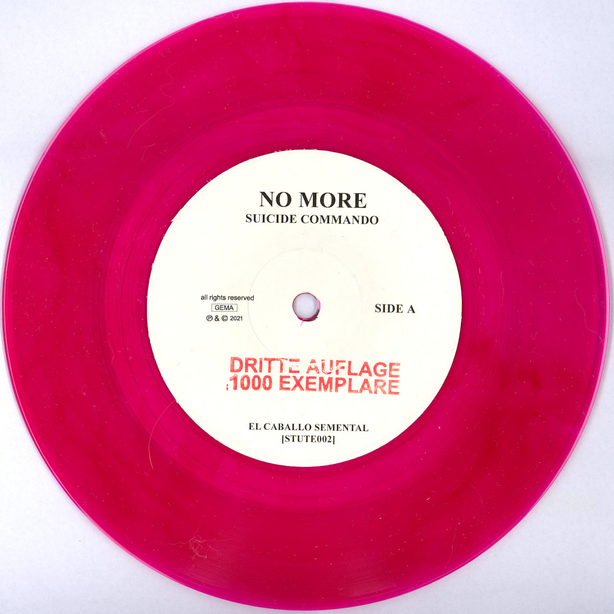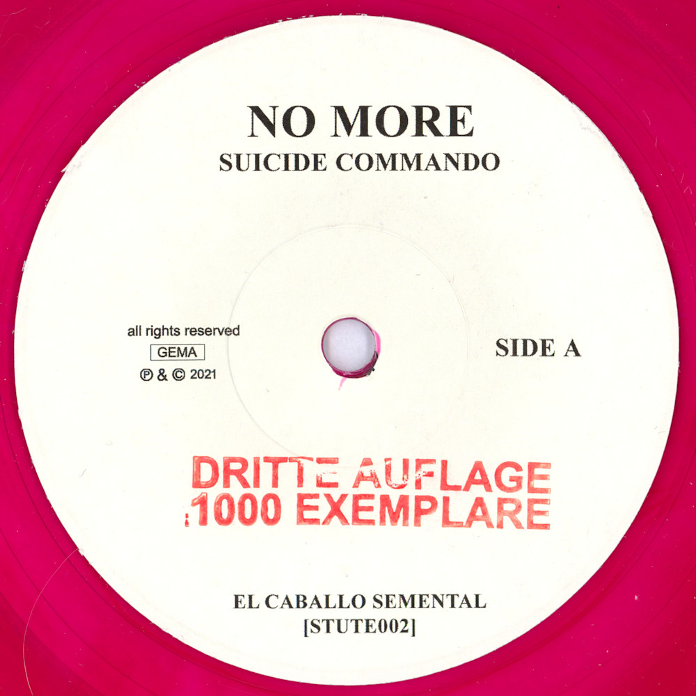 (22.04.2022 el caballo semental stute002) 7" transparent pink vinyl a1 suicide commando b1 in a white roomthis record is a remastered re-release of the original 7" single from 1981. original artwork by no more / s.brose lyrics by a.schwarz, music by a.schwarz / t.sanudakura / c.darc nomoremusic.eu (p) & (c) 2021 format: 7", third pressing, purple vinyl, additional stamp on label. limited to 1000 copies |