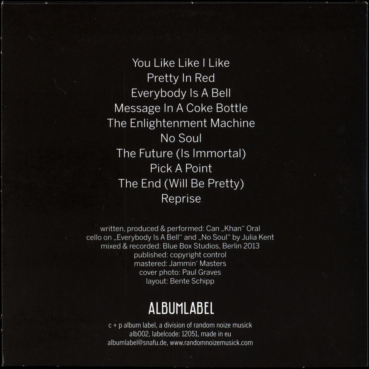 (2013 albumlabel alb002) cd promo 01 00:02:00 06:07:48 you like like i like 02 06:09:48 06:26:49 pretty in red 03 12:36:22 05:10:43 everybody is a bell 04 17:46:65 03:48:41 message in a coke bottle 05 21:35:31 06:10:04 the enlightenment machine 06 27:45:35 03:12:57 no soul 07 30:58:17 03:27:41 the future (is immortal) 08 34:25:58 03:30:35 pick a point 09 37:56:18 02:47:68 the end (will be pretty) 10 40:44:11 04:26:23 reprise cd 45:08:34written, produced & performed: can 'khan' oral cello on 03 and 06 by julia kent mixed & recorded: blue box studios, berlin 2013 mastered: jammin' masters. cover photo: paul graves. layout: bente schipp |