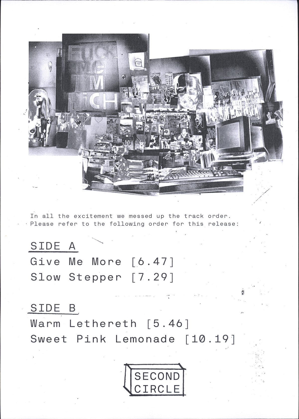 a1 give me more 6:47 (direct drive limited 1994) a2 slow stepper 7:29 (original slow version previously unreleased) b1 warm lethereth 5:46 (socket records 1996) b2 sweet pink lemonade 10:19 (mille plateaux 1994)