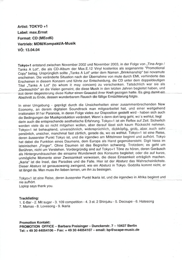 (11.2000 max.ernst max.E.-cd1 / 4035175040045) cd 01 00:02:00 05:48:60 10 tracks made with two decks, an isolator, 02 05:50:60 06:49:65 a mixer and some with a tc multieffect. 03 12:40:50 04:36:48 about 15 endless grooves, cut with a knife 04 17:17:23 06:33:63 in the last groove of vinyl records, some 05 23:51:11 03:40:46 voices from records as well, and feedbacks 06 27:31:57 04:52:21 are the sound sources. the loops are cut 07 32:24:03 07:10:46 between 1978 and 2000 like the one on 08 39:34:49 04:54:33 supposé 08 (frean loop). 09 44:29:07 07:01:66 thomas brinkmann 10 51:30:73 05:49:38 mastering lu-sky-d cd 57:18:36 |