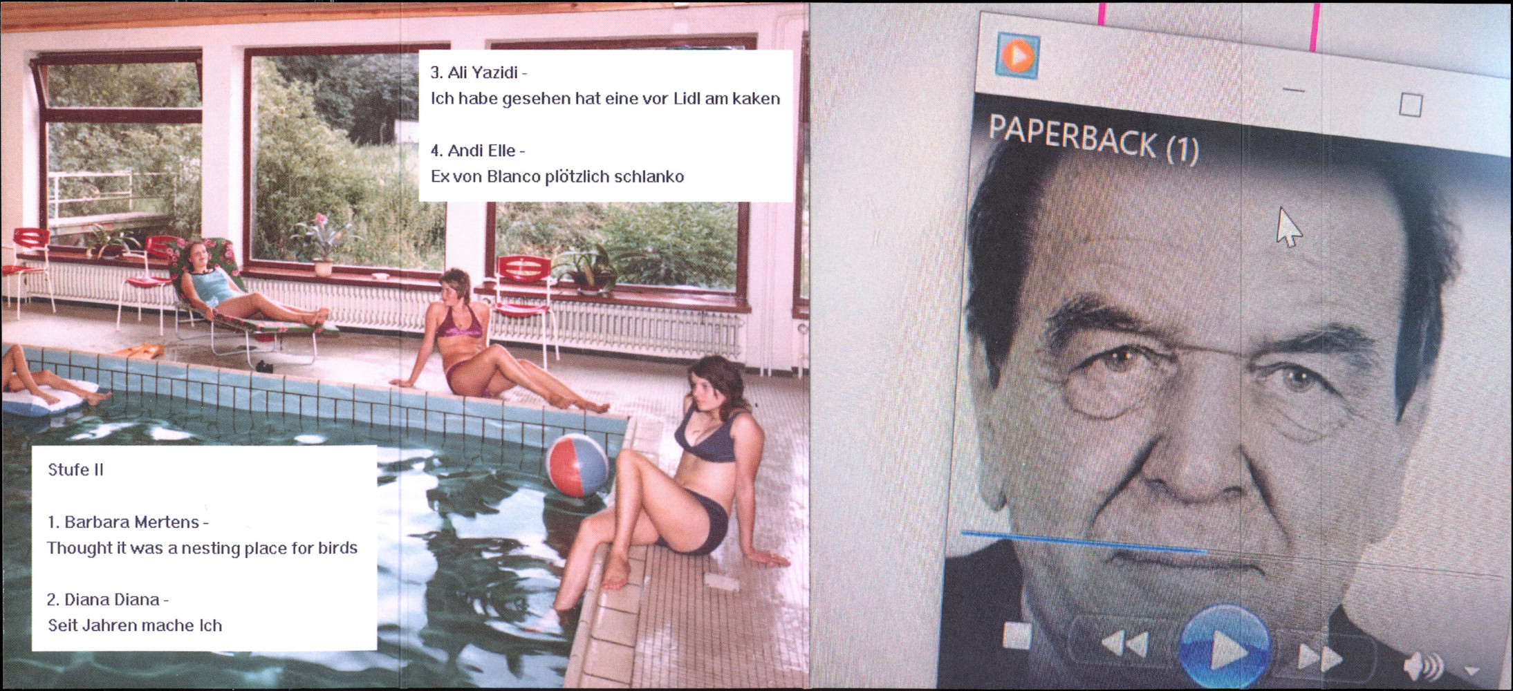 a01 diese femen kennen kein pardon 2:08 a02 the josh boidin quartet 3:10 a03 indifis 0:08 a04 roses 2:22 a05 untitled 2:02 a06 frankfurt 1:05 a07 barry lyndon vi 0:45 a08 sabrina 1:05 a09 ah 1:23 a10 frut 0:55 a11 petra 1:56 a12 emped - bibd bin 2:39 a13 breakthing 5:03 a14 agustinia bathing in a swamp beach (fly over) 0:59 a15 grem 0:31 a16 the melting 3:28 b01 caveman finds my ableton and makes funny music 1:37 b02 mgnha ma dah 1:26 b03 spiel 0:43 b04 keyboard frau 1:44 b05 12 jahre alt 1:38 b06 keyboard mädchen 2:07 b07 abklang 20:09