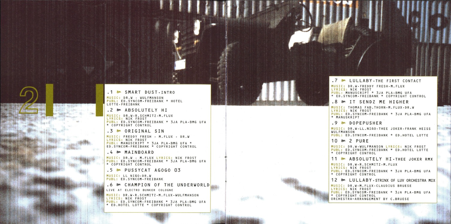 (2000 syncom productionz / hotel lotte lotte uk/usa 01 / 4039691050014) cd 01 00:02:00 07:00:37 smart dust - intro 02 07:02:37 04:50:47 absolutely hi 03 11:53:09 03:58:63 original sin 04 15:51:72 08:31:66 mainboard 05 24:23:63 06:12:71 pussycat agogo 03 06 30:36:59 04:09:47 champion of the underworld (live at elektro bunker cologne) 07 34:46:31 08:53:04 lullaby - the first contact 08 43:39:35 07:56:15 it sendz me higher 09 51:35:50 06:15:66 dopepusher 10 57:51:41 04:57:09 2pure 11 62:48:50 04:57:10 absolutely hi - thee joker rmx 12 67:45:60 04:03:30 lullaby - strinx of luv orchestra mix cd 71:47:15 |