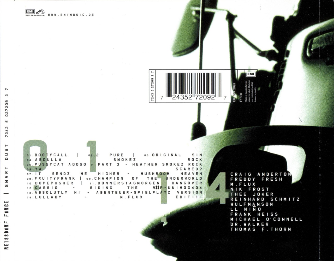 (2000 syncom productionz / emi electrola 7243 5 27209 1 0) 2x12" lp 1 side one 01 bootycall 04:17 02 2 pure 04:55 03 original sin 03:55 04 abdulla smokez rock 05:10 lp 1 side two 01 pussycat agogo part iii - heather smokes rock 06:15 02 ya scared 05:52 03 it sendz me higher - mushroom heaven 07:56 lp 2 side one 01 fruity frank 05:41 02 champion of the underworld 04:04 03 dopepusher 06:15 lp 2 side two 01 donnerstag morgen hangover 03:38 02 cabrio - riding the r$$f-unimog404 03:59 03 absolutely hi - abenteuerspielplatz version 04:50 04 lullaby - m.flux edit 04:02produced by dr.walker & rei$$dorf force 4 syncom productionz coverdesign by motype |